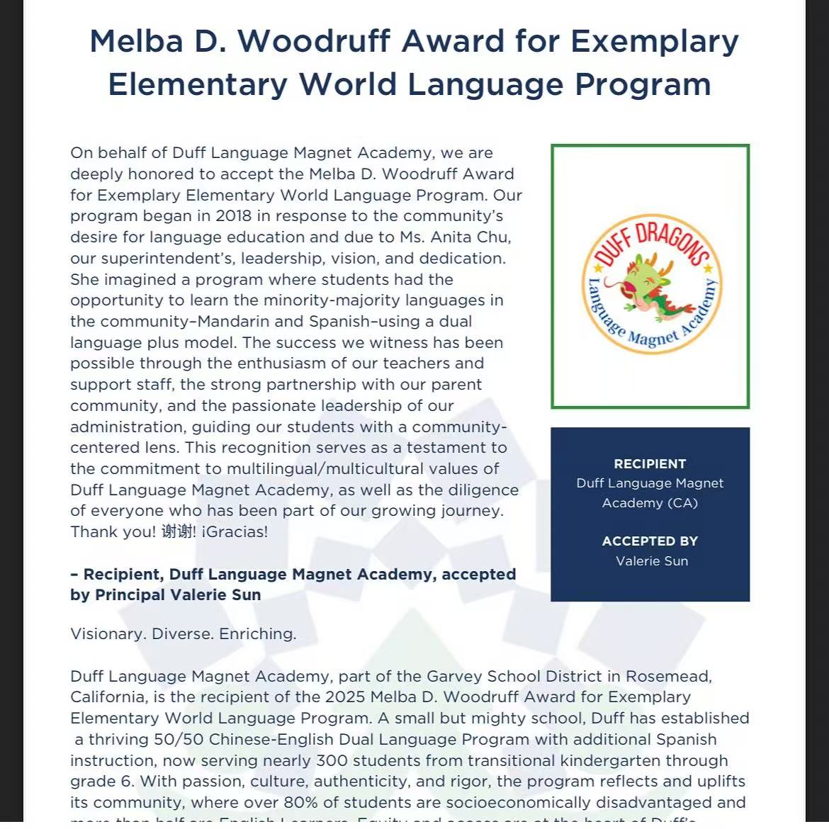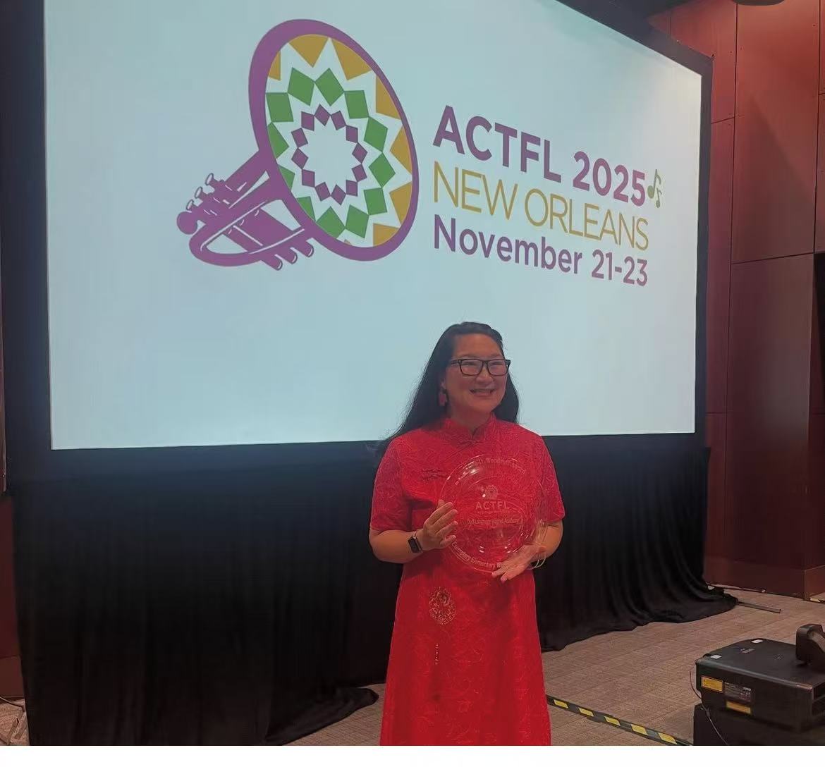 We first celebrate our recent guest speaker and CLTA-SC lifetime member, Dr. Valerie Sun, on receiving the Melba D. Woodruff Award from ACTFL. This distinguished national award honors her outstanding contributions to world language education. Dr. Sun’s achievement brings great pride to our community and shines a national spotlight on the work of Chinese language educators.