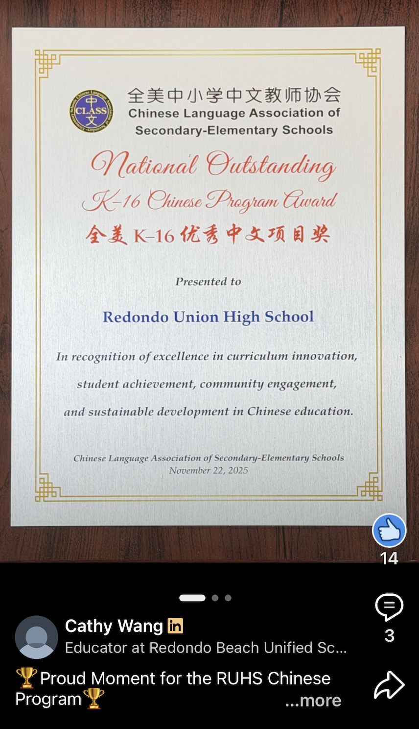 We are also incredibly proud of the Redondo Union High School (RUHS) Chinese Program for being selected as a 2025 National Outstanding K–16 Chinese Program by CLASS. This award recognizes the program’s excellence in curriculum innovation, student learning, and community engagement. Special congratulations go to CLTA-SC member Ms. Cathy Wang for her dedicated instructional leadership and her ongoing efforts to strengthen Chinese language education in Southern California.
