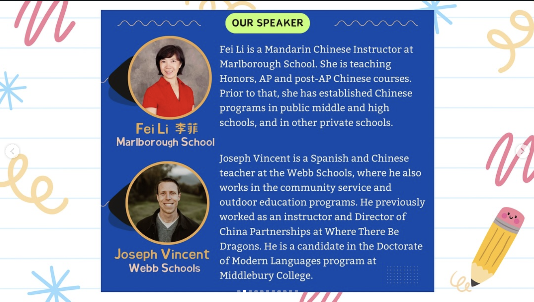 We would like to sincerely thank our two guests, Fei Li from Marlborough School and Joseph Vincent from Webb School, for their insightful sharing during this 2025/02/24 webinar, which filled the event with wisdom and inspiration! We also appreciate the host, Joyce Chu, and the enthusiastic participation of over fifty attendees, whose support made this online seminar a great success!✨